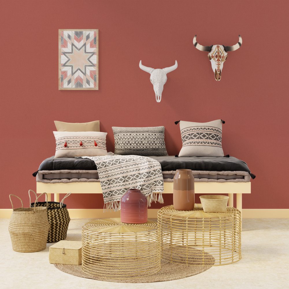 Un joli papier peint de couleur rouge brique, que je souhaiterais appliquer dans mon séjour (sur une petite surface) qui collera parfaitement à l’ambiance ethnique de ma pièce, et de par sa couleur fera le rappel sur plusieurs éléments de ma décoration et d’ameublement.